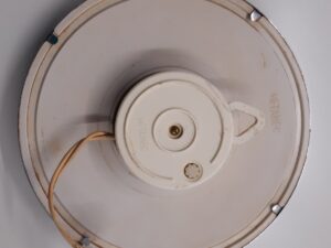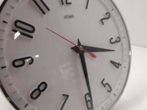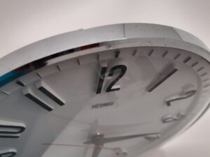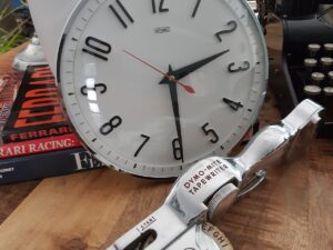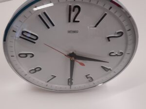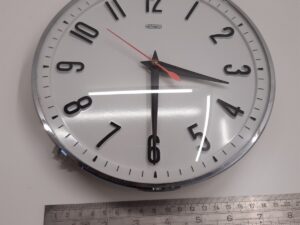 This clock is a great example of cool wall clocks made by Metamec of Dereham, England. It has cool vintage industrial design. The clock is made of white plastic with a chrome bezel and it has black numerals and black / Red hands, with a glass convex front and chrome.