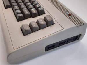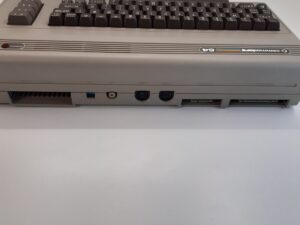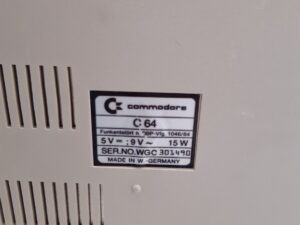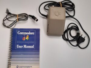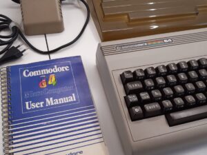 A vintage Commodore 64 (C64) with power adapter, dust cover and original C64 manual. This famous retro computer is like the VW beetle amongst the vintage home computers.