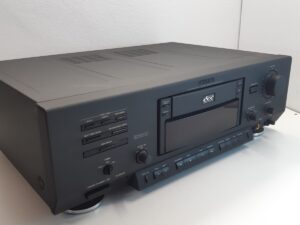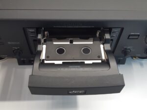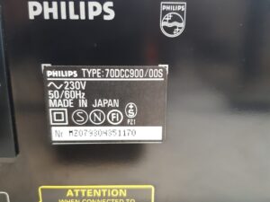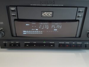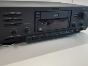 This Philips DCC 900 series compact cassette player / recorder was the flagship model from Philips. Following the success of the (analog) Compact Cassette in the 1960s and the (digital) Compact Disc in the 1980s, Philips introduced the ‘Digital Compact Cassette’ (DCC) in the 1990s: Digital recording and playback on a Cassette System. The competitor of DAT recorders, with the advantage that old-fashioned cassettes can also be played on them.