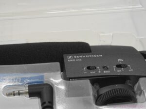 A Sennheiser MKE 400 shotgun microphone, a compact and powerful audio recording solution. With its shotgun design, it captures clear and focused sound, making it ideal for video production, interviews, and vlogging. The MKE 400 features a supercardioid pickup pattern that effectively reduces background noise and focuses on the audio source in front. This ensures professional-quality sound recordings even in noisy environments.