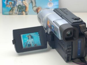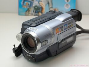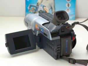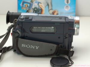 A classic Sony DCR-TRV140E video camera, record high-quality video with high-fidelity stereo sound, directly to digital Hi8 tapes. A 2.5-inch LCD full-color display pivots in multiple directions. This digital camcorder also has a black-and-white display through the viewfinder. It also has the capability to film in the dark, with the Nightshot feature!