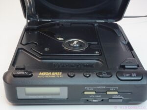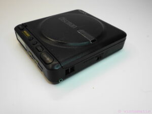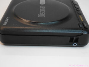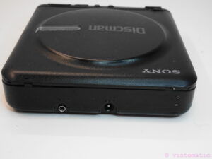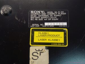 A vintage Sony Portable Discman D-22 . This Discman was first introduced in 1989. A small portable stereo compact disc player powered either by 4 x AA batteries or by the supplied 9 volt AC mains adapter. Can also be powered by a car battery via the optional CPM-100P/200P car mounting kit which plugs into the car cigar lighter.