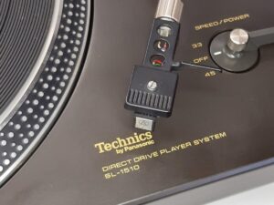 A nice Technics (by Panasonic) SL-1510 vintage turntable with some traces of use, mainly on the top cover. Comes with original mat. Stylus is in place. Very nice and solidly built turntable. This is a fairly heavy turntable with a very decent weight in the platter.