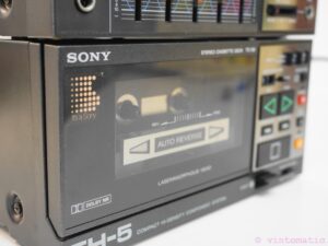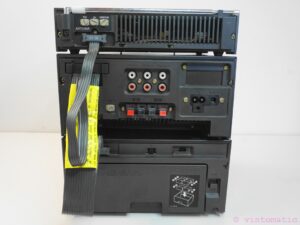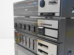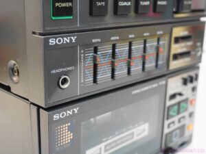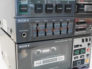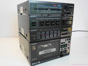 A rare 1980’s Sony FH-5 Cassette Recorder Boombox. It is a 3-piece boombox, it comprises of the ST-58 AM/FM tuner, TA-58 integrated amplifier, TC-58 cassette deck. This set is missing the detachable speakers and the metal brackets to hold it together. The system turns on, but the tapedeck is defect, it does not play, only Fast Forward works. Sold for spares repairs or decoration purposes. Sold as is, no guarantee.