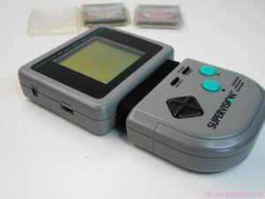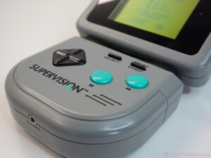 Vintage original Watara Supervision Handheld game console in very good condition with three games. The Watara Supervision, is a monochrome handheld game console, originating from Asia, and introduced in 1992 as a competitor for Nintendo’s Game Boy. A rare retro gaming console to add to your collection or just play with!