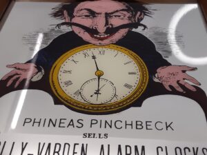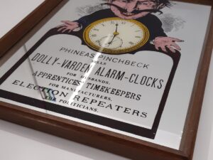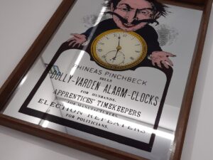 A wonderful rare vintage “Phineas Pinchbeck” printed advertising mirror. Wonderfully quirky rare advertising mirror. It says “Phineas Pinchbeck sells Dolly-Varden Alarm-Clocks for husbands, apprentices’ timekeepers for manufacturers, election repeaters for politicians” and has a looming eerie depiction of Mr. Pinchbeck.