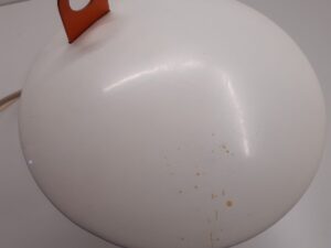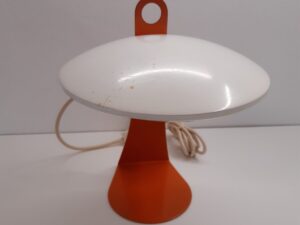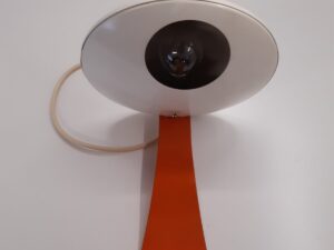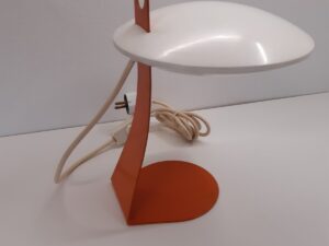 This desk lamp is a great example of cool lamps made in the 1960’s. It has a cool space age design. It is not branded, but it looks like it a design by Aluminor (Nice, France). Painted metal Orange/White. Overall good used condition. Some marks/stains on the top cover (see pictures)