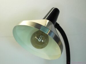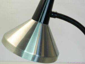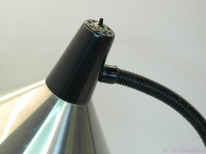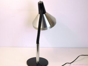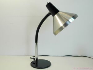A beautiful vintage mid-century industrial design desk lamp (period 1960-1970). Designed by Hala Zeist the Netherlands. Great industrial design. The lamp is made from aluminum and has a heavy metal base. It also has a plastic cover along the metal bendable neck. The lamp has a great brushed aluminum finish and is in very good condition, some minor scratches and marks of use, but nothing serious.