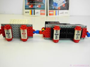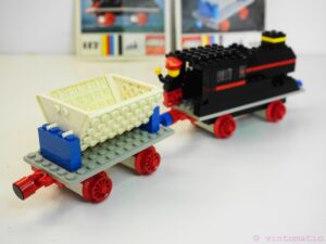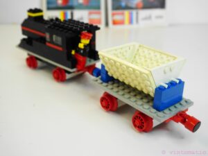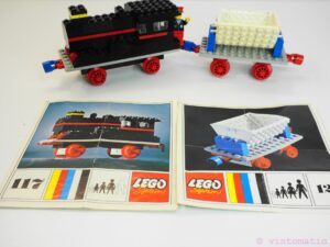 A vintage highly collectible Lego system set from the late 1960’s, Locomotive without Motor number 117 and Tipping Wagon number 125. This locomotive was released by Lego in 1967 and the tipping wagon in 169, Comes with the original instruction booklet and an extra Lego figure. The locomotive is missing one tiny part, namely the whistle on the top of the locomotive (Black Brick, Round 1 x 1 Solid Stud), the rest looks to be original and complete, did not check if these are all the original bricks. A great vintage Lego set to play with or for decoration!