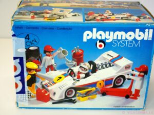 Playmobil 3520 formula 1 racing car. This set was released by Playmobil in 1979. This set contains the first race car published by Playmobil. The rear can be lifted so that you can take out the engine. Includes 4 Playmobil figures including a driver with helmet, oil barrel, jerry can, jack, tools and a finish flag. Comes with original box.