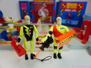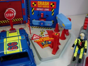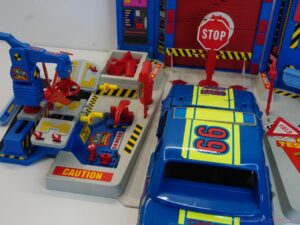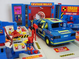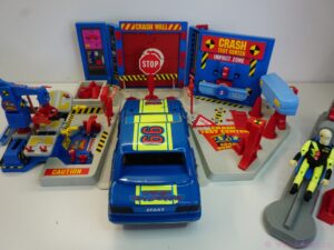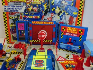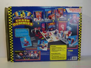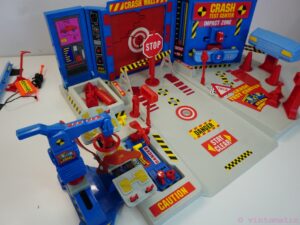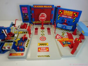 This official Crash Dummies playset from Tyco from the 1990s comes with the original packaging. The set itself originally contained no figures or vehicles. This set comes with an extra vehicle and two figures. The Test center set is 99.9% complete, only the truck bumper is missing a rubber flap (see photo). For the rest as good as complete with the extra figures and car. Works with all crash dummies and figures. Complete with box and instruction manual (English/French).