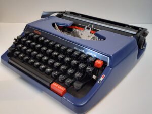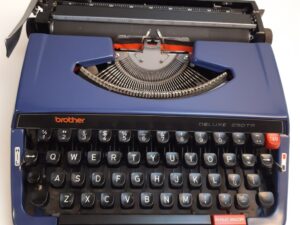 This portable vintage blue typewriter model Deluxe 250TR was manufactured by Brother in Nagoya, Japan in the 1970s. It comes with the original hard case.