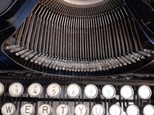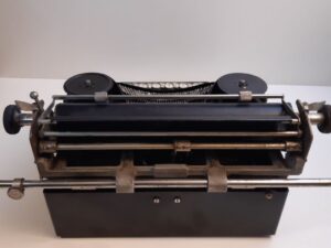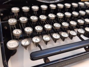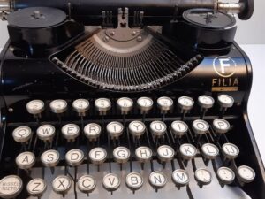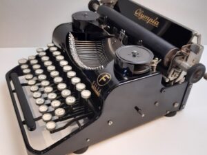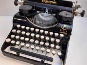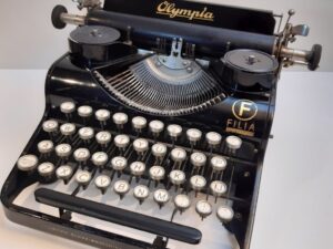 Olympia Filia antique typewriter ca. 1935 portable typewriter. A very interesting machine with unusual features like the glass keys and no Caps-lock, no backspace, no color picking. Just a shift key and a keyboard.